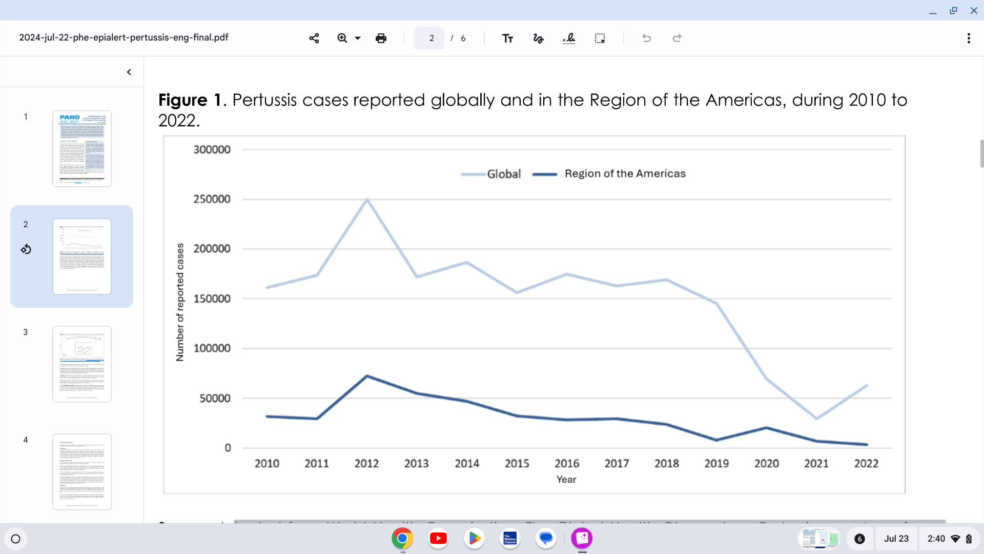 In the Region of the Americas, 2012 was the year with the highest number of cases reported during the decade, with 72,328 reported cases of pertussis. Since then, there has been a progressive annual decrease in the reported cases, reaching the lowest number reported in 2022, with 3,283 pertussis cases.