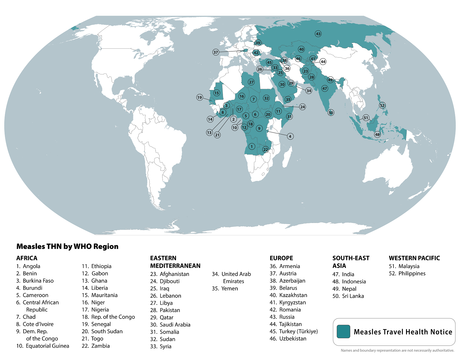 In July 2024, the U.S. Centers for Disease Control and Prevention (CDC) listed the top ten international measles outbreaks led by Azerbaijan, Kazakhstan, Iraq, and India. In total, the CDC listed 52 countries.