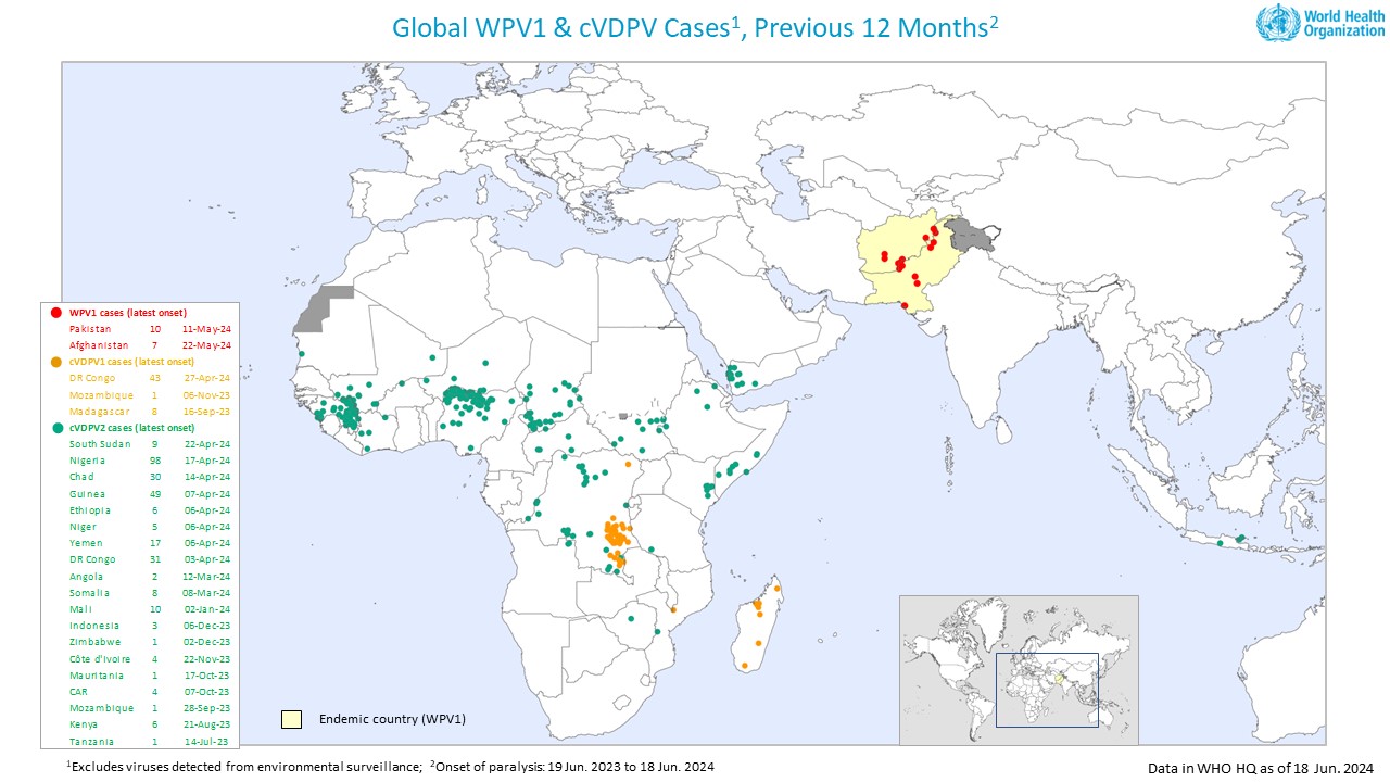 On June 19, 2024, the GPEI reported that Afghanistan confirmed one wild poliovirus type 1 (WPV1), bringing the total number of cases in 2024 to six.