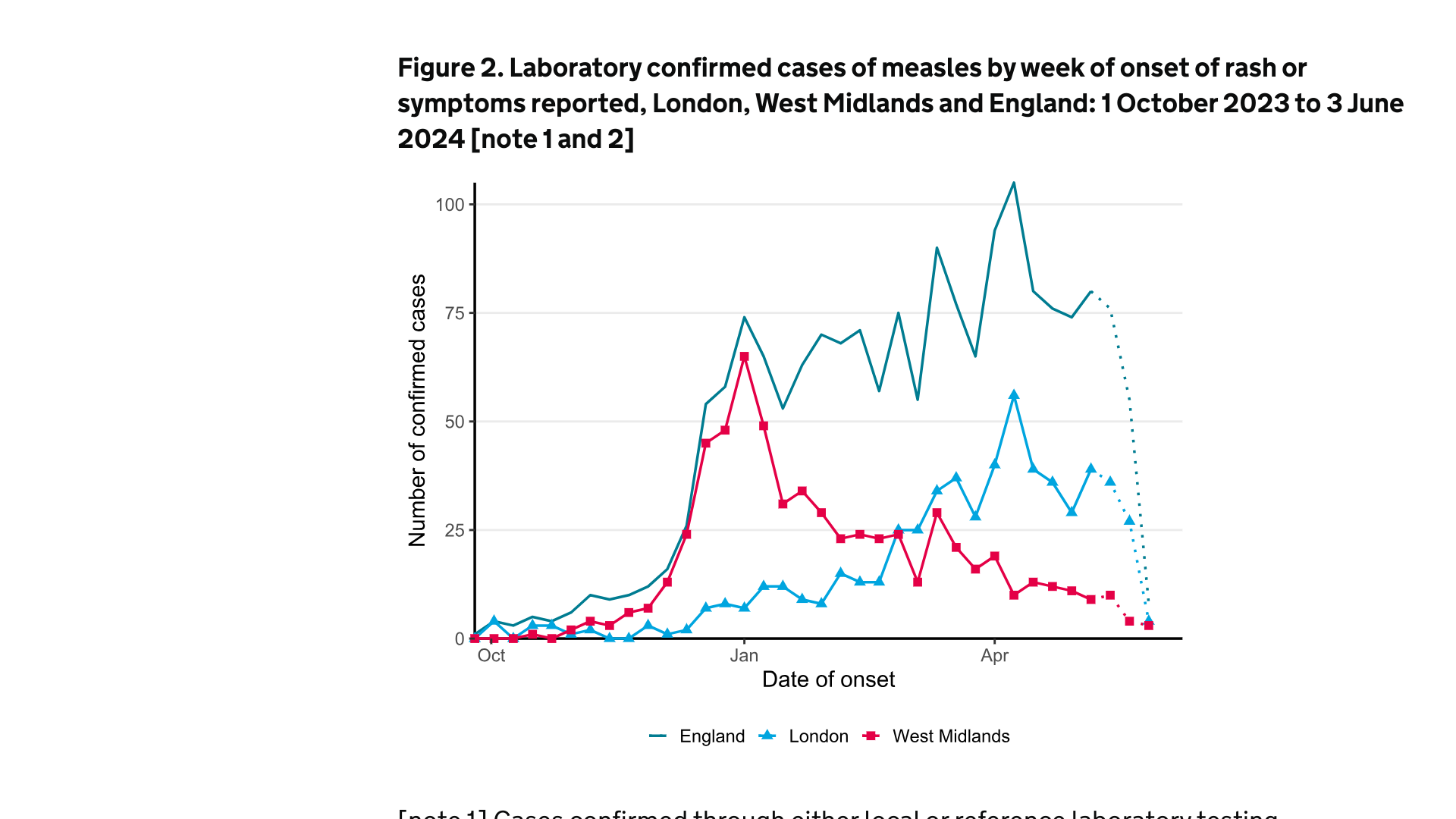 As of June 3, 2024, the U.K. Health Security Agency (UKHSA) reported 1,749 laboratory-confirmed measles cases had been reported in England since October 2023.