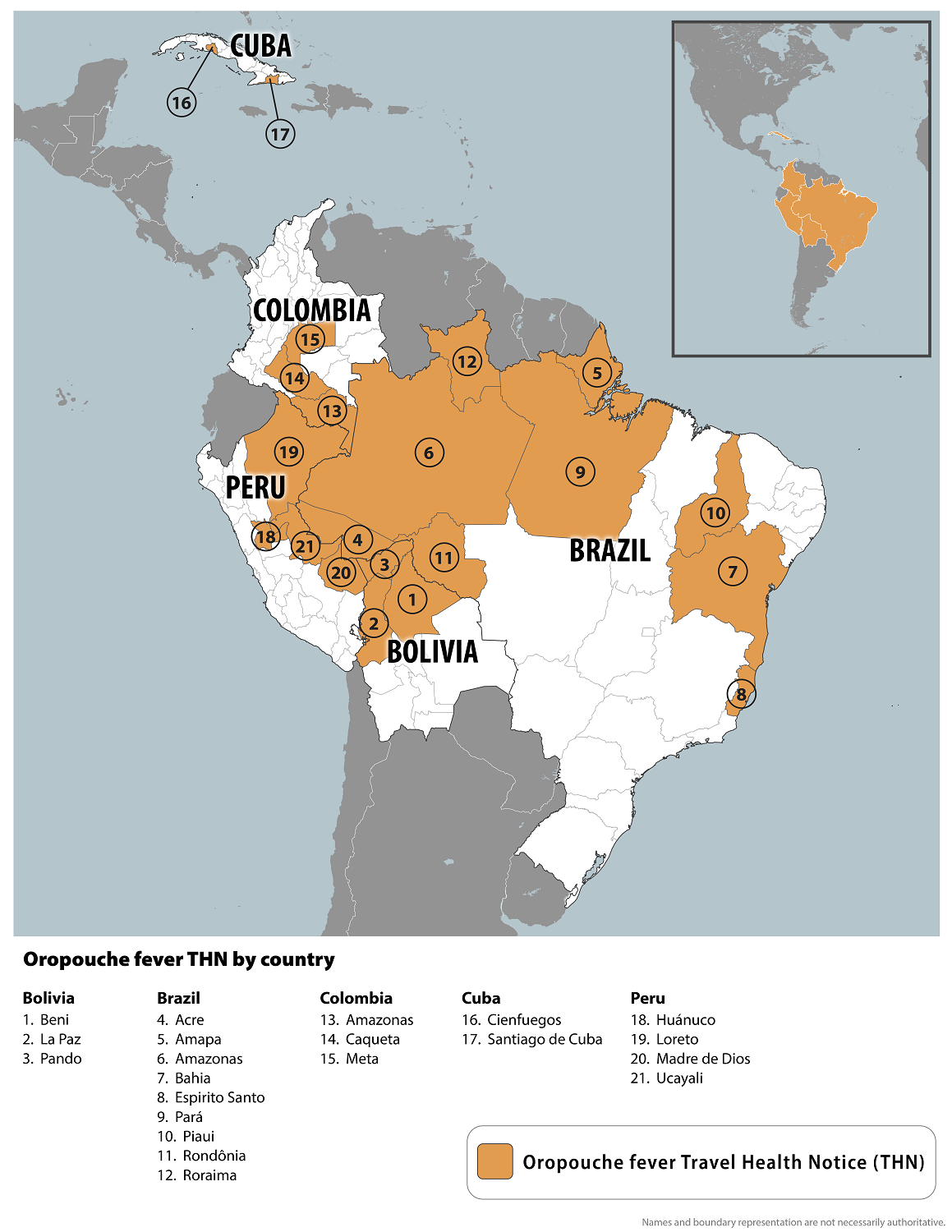 The U.S. Centers for Disease Control and Prevention (CDC) reported today that Oropouche fever outbreaks occur in 21 countries, including parts of Brazil, Bolivia, Colombia, Peru, Cuba, Ecuador, Panama, and Peru.