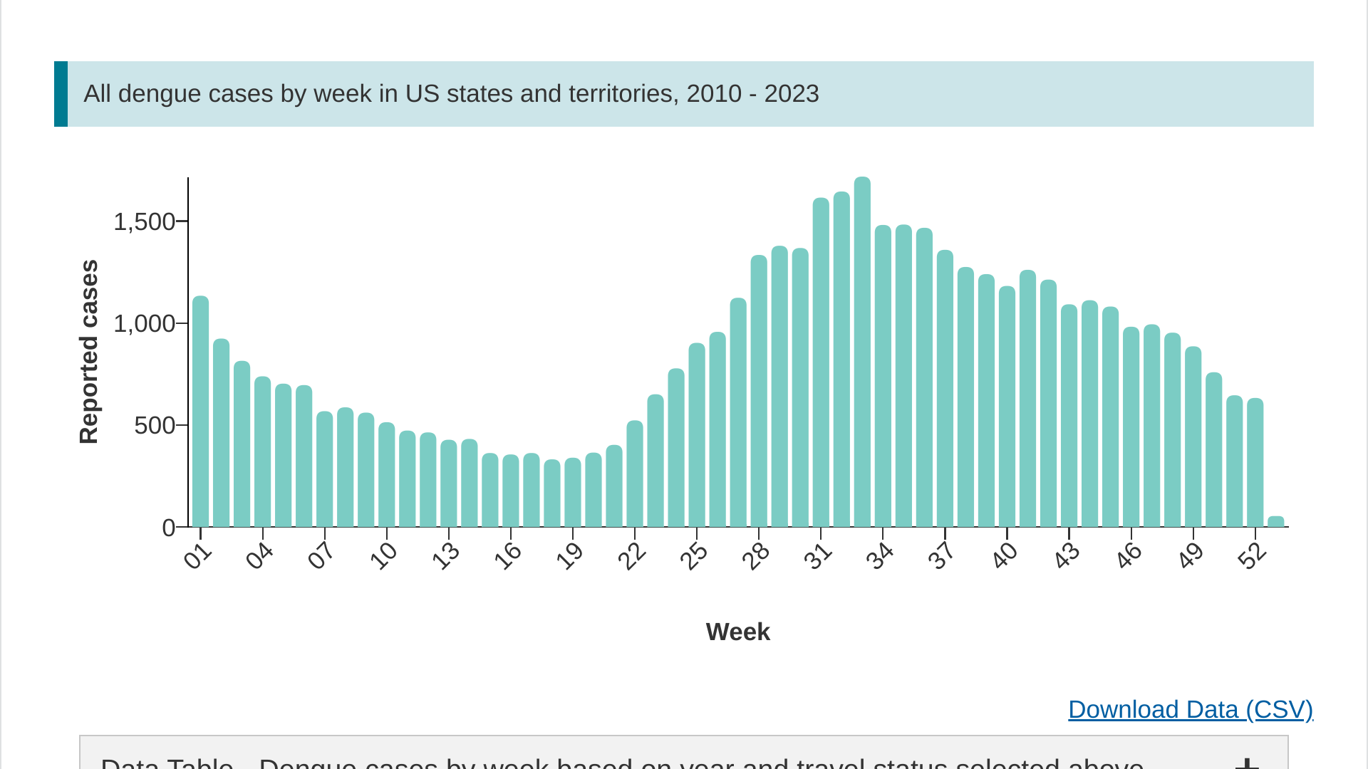 Over the past 13 years, most dengue cases have been reported during week #33, which is in August.