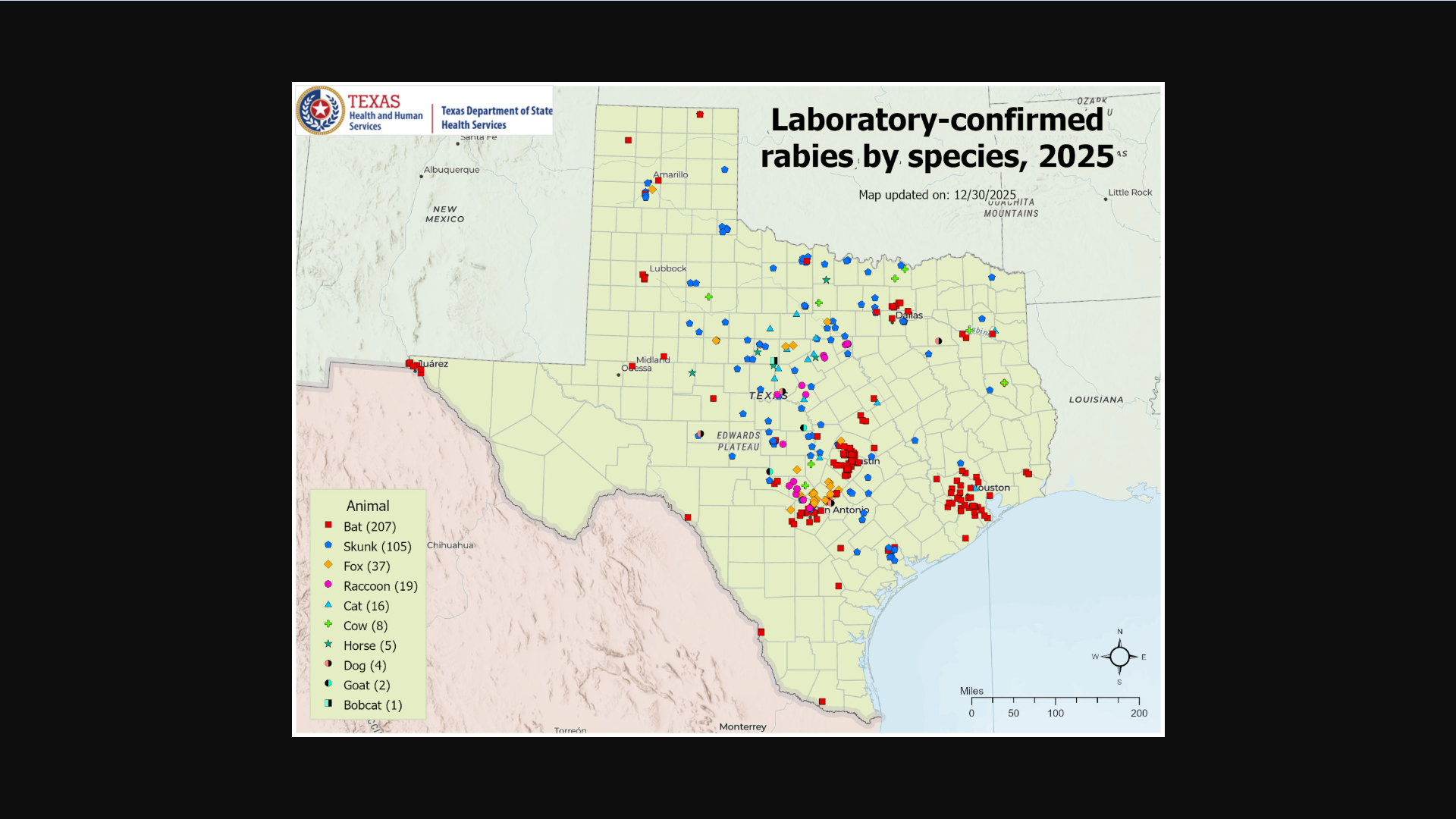 In 2025, DSHS and the U.S. Department of Agriculture conducted air-dropping of oral rabies vaccines in several states to help reduce wildlife outbreaks.