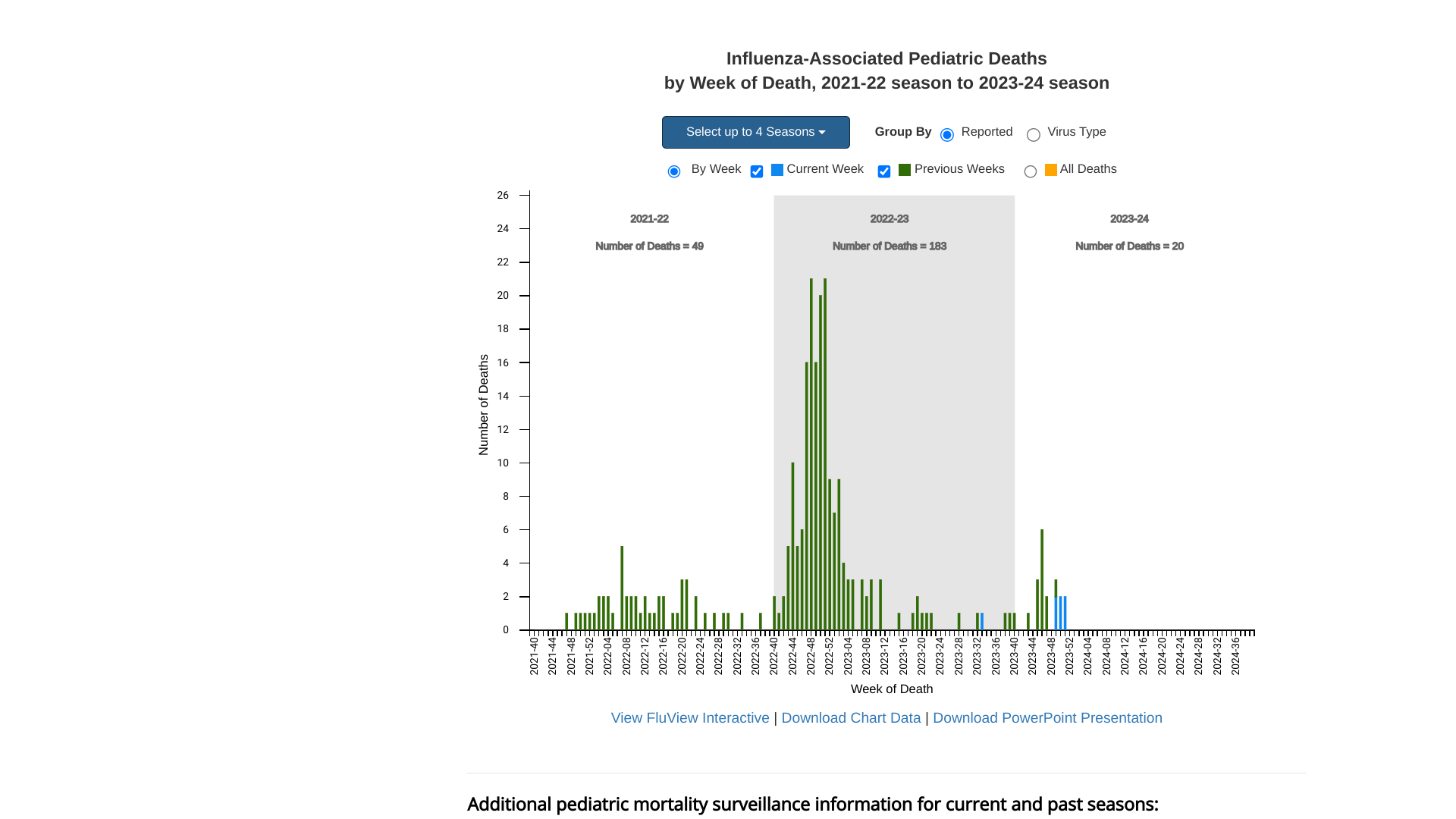 As of December 29, 2023, the CDC confirmed a total of 20 pediatric deaths have occurred during the 2023-2024 season.