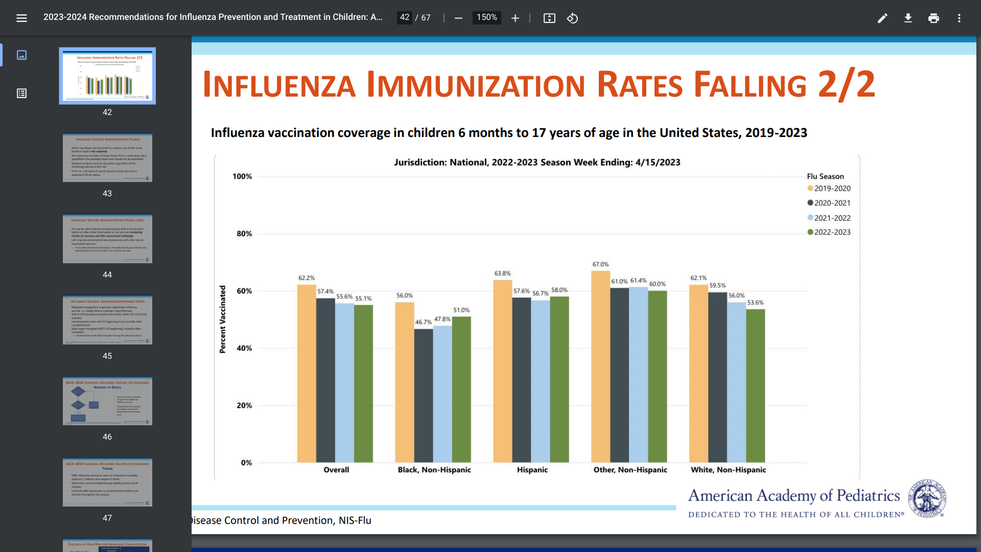 This digital presentation revealed on slide #42 that influenza vaccination coverage in children six months to 17 steadily decreased during 2019-2023.