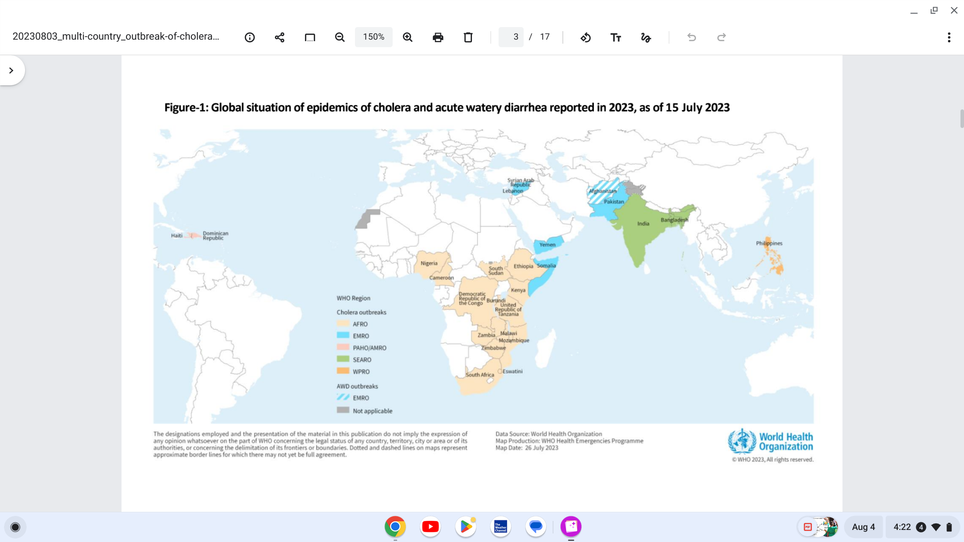 The World Health Organization's (WHO) latest multi-country cholera outbreak situation (#5) says that Based on the large number of outbreaks and their geographic expansion, WHO continues to assess the risk at the global level as very high.