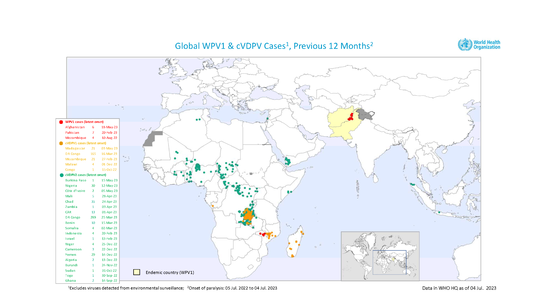 On July 28, 2023, the WHO announced the detection of a circulating vaccine-derived poliovirus type 2 (cVDPV2) in two acute flaccid paralysis (AFP) cases and two asymptomatic healthy children community contacts from the Hagadera camp in Kenya.