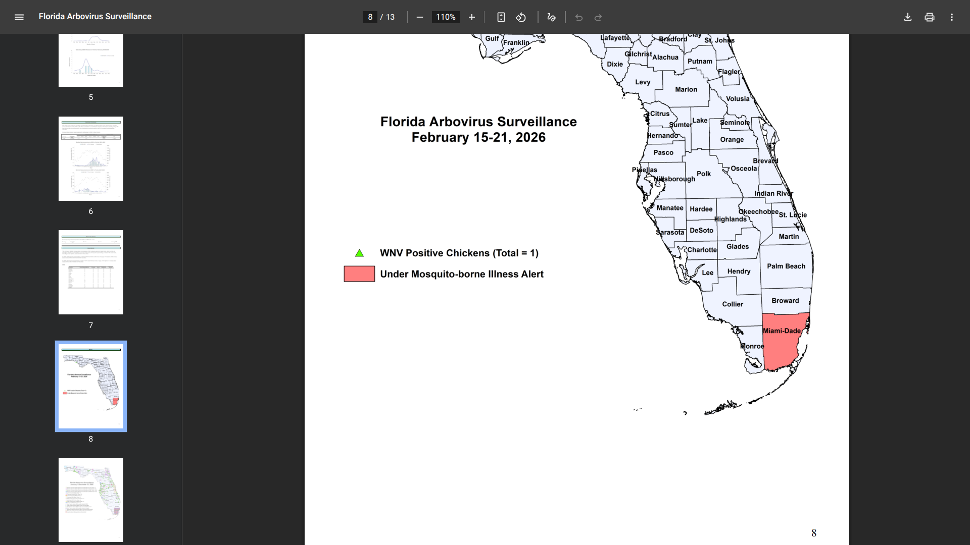 According to the Florida DOH's most recent Arbovirus Surveillance Report (Week 7, covering February 15–21, 2026), there have been 21 travel-associated chikungunya cases statewide, with 13 in Miami-Dade County, all linked to Cuba. In 2025, there was one locally acquired dengue case in Miami-Dade County, which began in December.