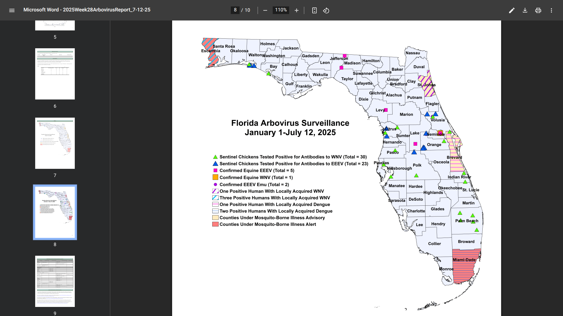 As of July 12, 2025, Florida Department of Health confirmed Escambia and Miami-Dade counties remain under mosquito-borne illness alerts.