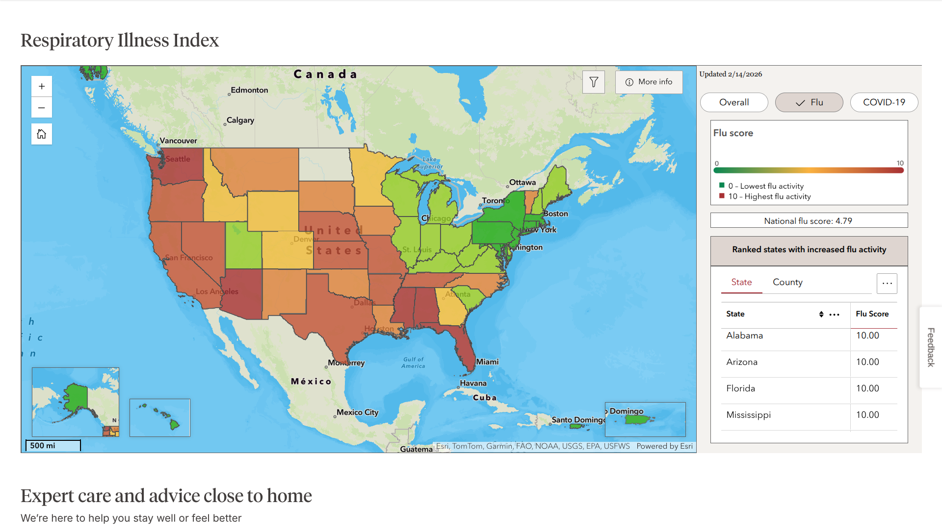 The Index also highlights maximum intensity in several southern states, including Alabama, Arizona, Florida, and Mississippi, where respiratory illness activity—driven largely by ongoing flu circulation—remains at peak levels.