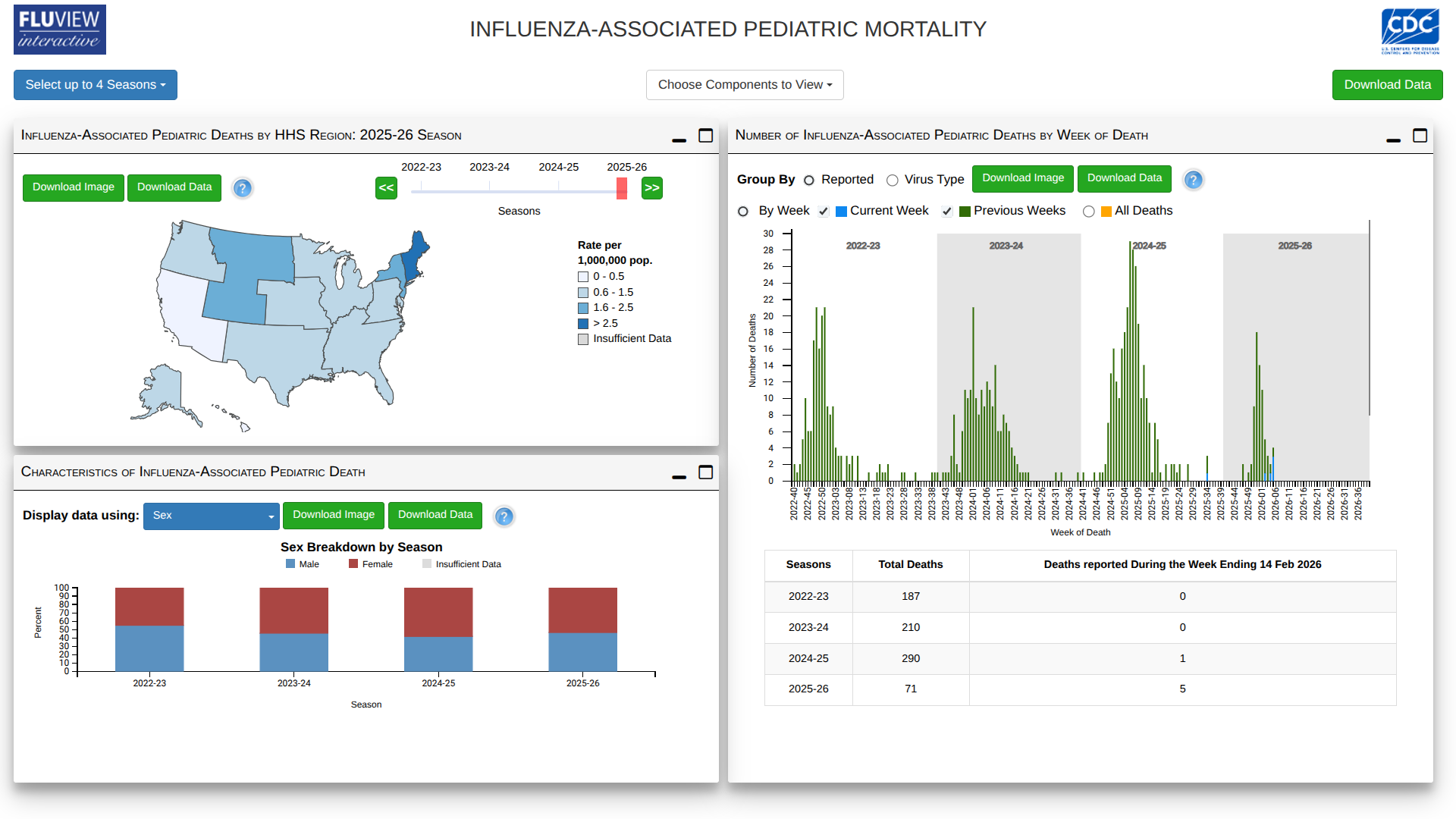 Of the reported deaths on February 14, 2026, five occurred during the current 2025-2026 flu season, bringing the total number of pediatric fatalities this season to 71. These deaths happened during Weeks 2, 4, and 5 (ending January 17, January 31, and February 7, 2026).