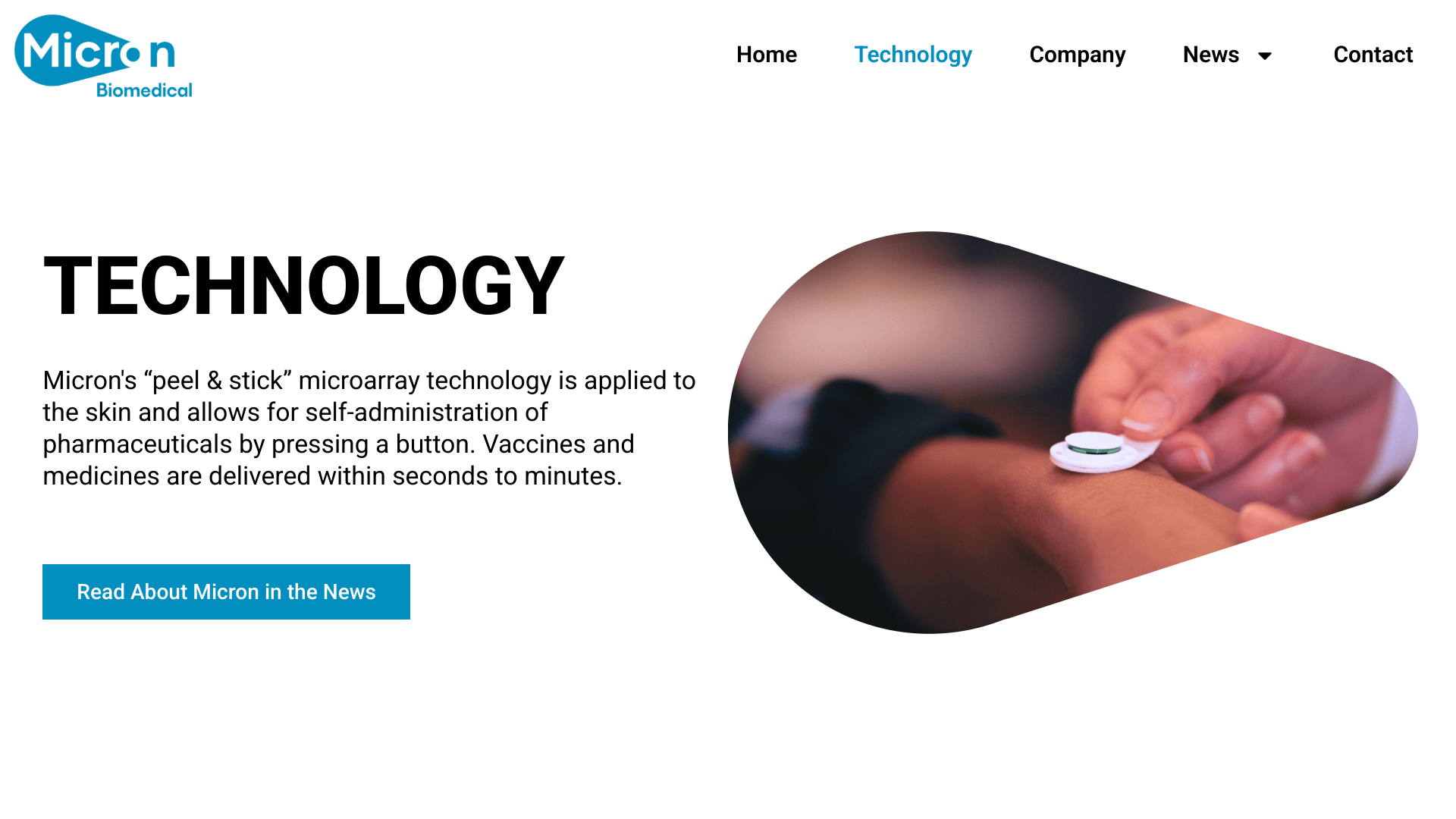 Micron’s technology uses a dissolvable microarray “button” applied to the skin. The button painlessly delivers a vaccine or therapeutic directly into the uppermost dermal layers when pushed. The button can be self-administered or administered by a caregiver or parent.