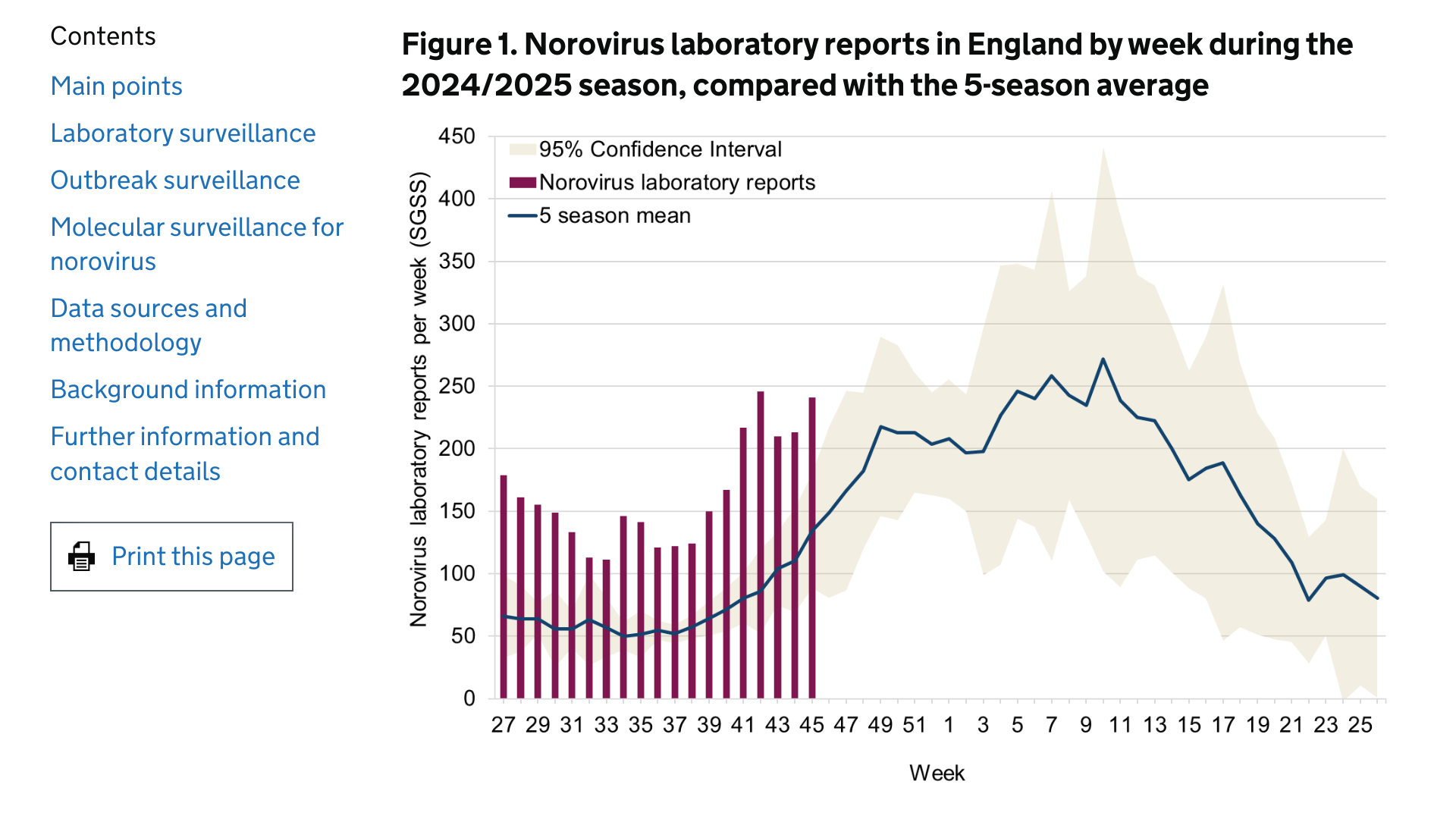 As of November 21, 2024, data derived from the Second-Generation Surveillance System up to week 45 of the 2024/2025 season showed that the cumulative number of positive norovirus laboratory reports in England (3,099 laboratory reports) was more than double the 5-season average for the same period (1,342 laboratory reports).