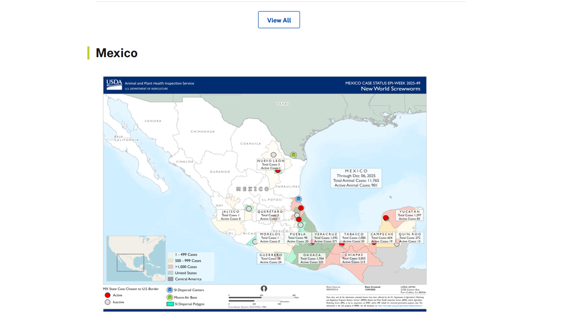 As of early December 2025, reports of myiasis cases in Chiapas, Oaxaca, Yucatán, Campeche, and Tabasco, totaling around 92 human cases, including five related fatalities.