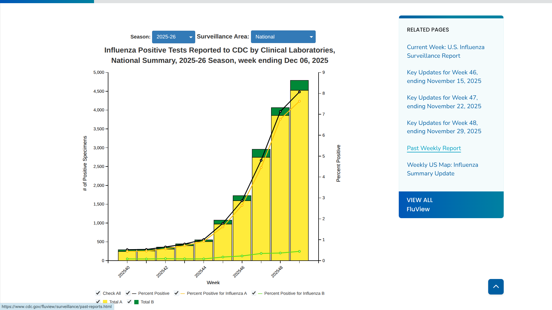 According to the U.S. CDC FluView Week 49 report, ending December 6, 2025. Colorado, Louisiana, and New York are seeing significant numbers of influenza detections.
