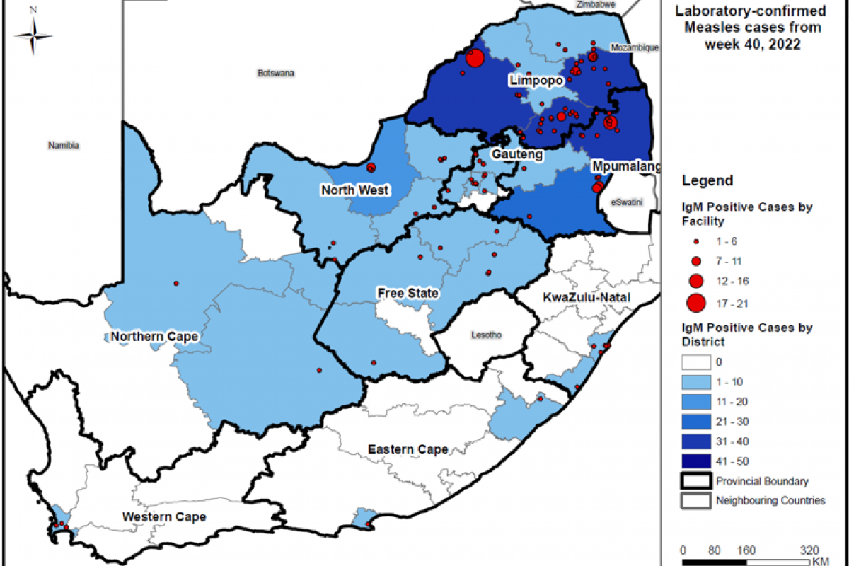 As of December 29, 2022, 297 laboratory-confirmed measles cases have been reported in South Africa for specimens collected as of epidemiological week #51 across all provinces.