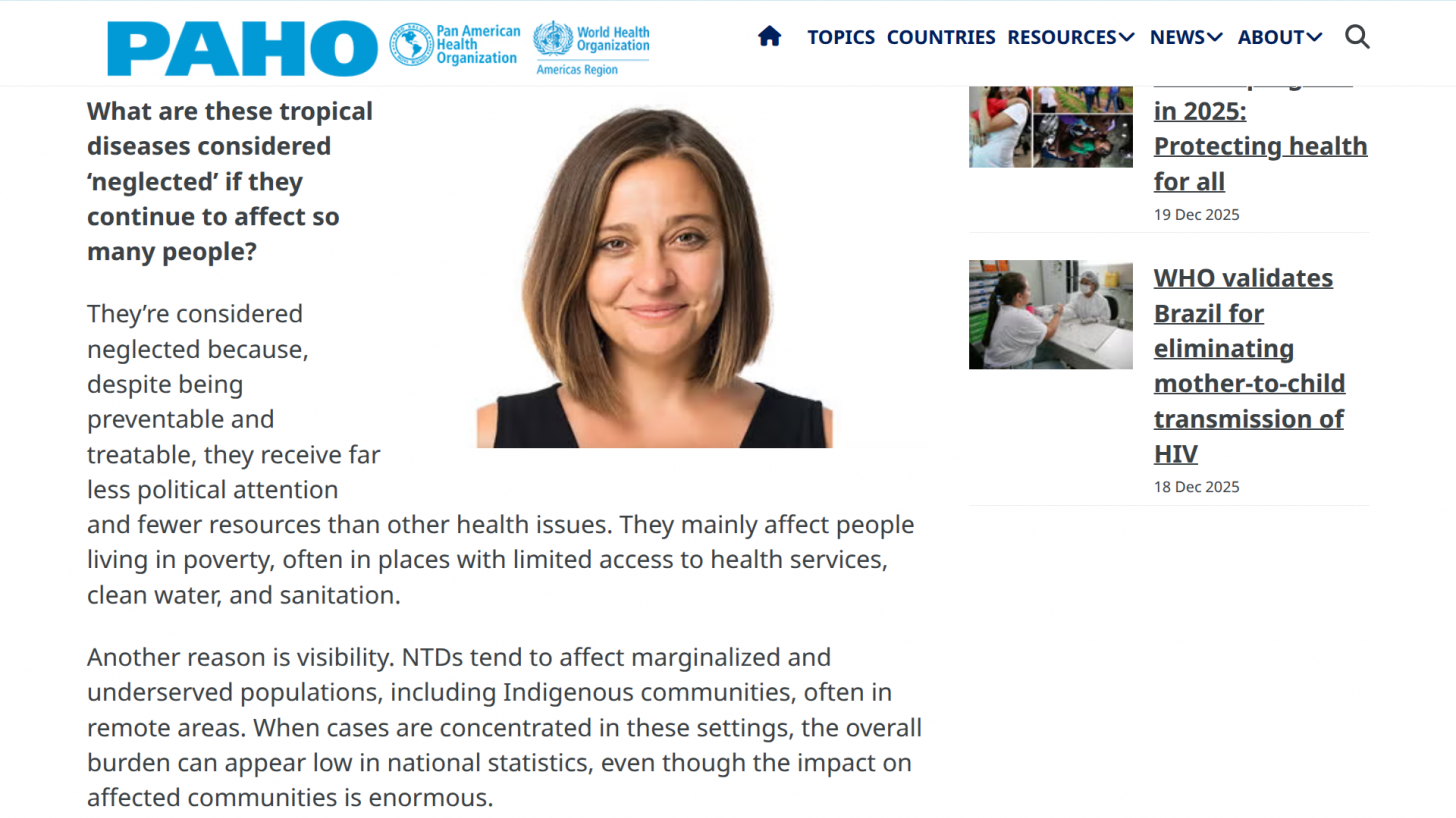 In a Q&A released on January 29, 2026, by PAHO, Ana Lucianez Perez, PAHO Regional Advisor on Neglected Infectious Diseases, shared insights from her work supporting countries in the region. She focuses on strengthening surveillance systems, enhancing data collection and management, and addressing gaps to reduce the overall burden of NTDs.