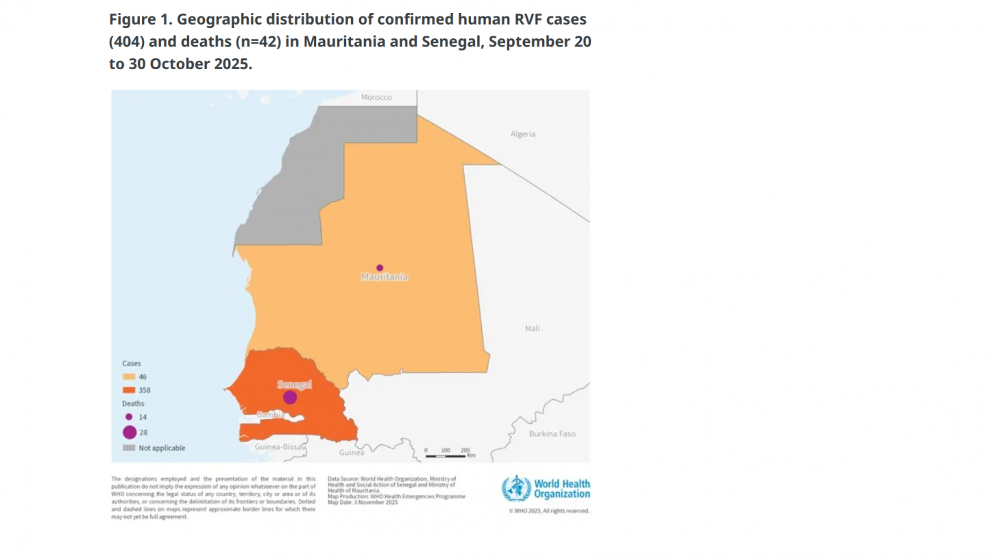 To provide an update, the WHO published a Disease Outbreak News article on November 5, 2025, confirming that between September 20 and October 30, 2025, a total of 404 confirmed human cases of RVF, including 42 deaths, were reported by Mauritania and Senegal.